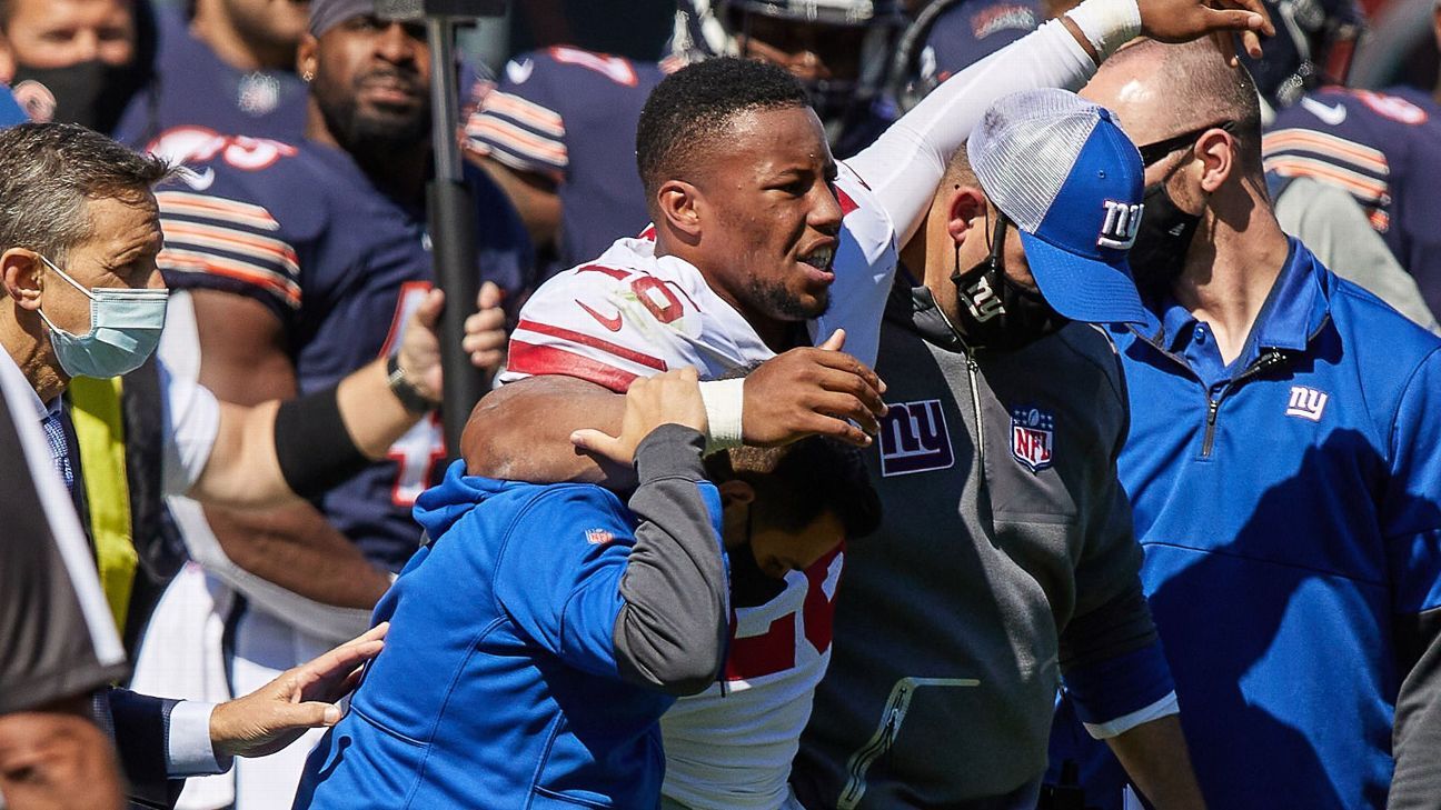 EAST RUTHERFORD, N.J. — This Sunday will be Saquon Barkley‘s first game back at Soldier Field in Chicago, where he tore the ACL in his right knee just over 15 months ago. Not that he’s trying to think about the moment that everything changed.