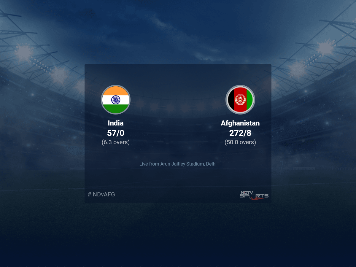 Follow the ICC Cricket World Cup 2023 live cricket score on Sports.NDTV.com. After 6.3 overs, India, chasing a target of 273, are 57/0. Get live score, ball by ball commentary and much more. Keep track of ICC Cricket World Cup 2023 today match between India and Afghanistan. Everything related to India and Afghanistan match will be available on Sports.NDTV.com. Stay updated with India vs Afghanistan live score. Do check for India vs Afghanistan scorecard. You can get scorecard updates, match related facts. Get quick live updates with ads, Sports.NDTV.com, which is the perfect destination for live cricket score.